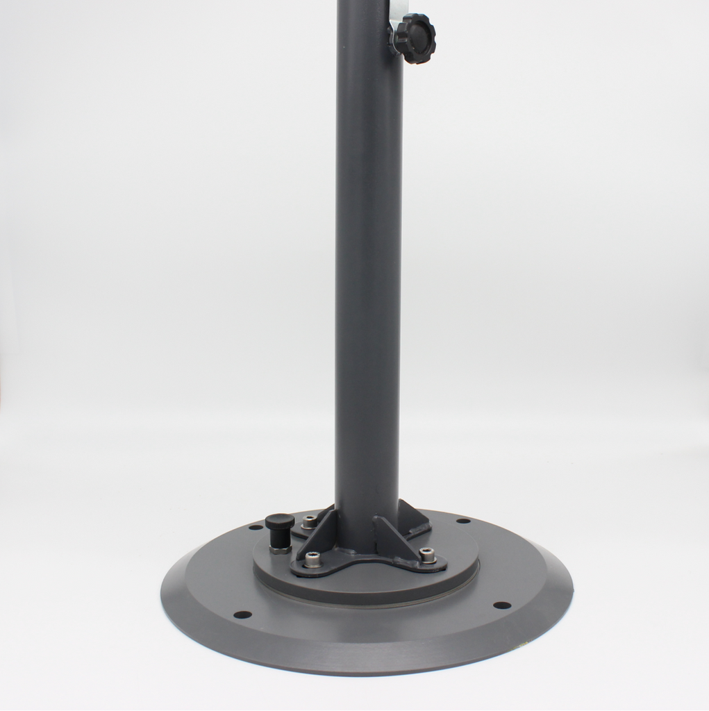 Le pied à fixer Plug and Play pour parasol droit et déporté est composé d'une base à fixer au sol et d'un disque amovible à fixer à votre parasol.